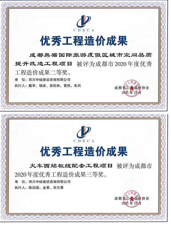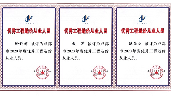 ? 四川中砝在成都市第五屆工程造價(jià)專業(yè)技能競(jìng)賽中榮獲“最佳估算編制獎(jiǎng)”、“團(tuán)隊(duì)一等獎(jiǎng)”及個(gè)人獎(jiǎng)共計(jì)13個(gè)獎(jiǎng)項(xiàng);同時(shí)在2020年度優(yōu)秀工程造價(jià)評(píng)選中榮獲“優(yōu)秀工程造價(jià)企業(yè)”;我司“成都熊貓國(guó)際旅游度假區(qū)城市空間品質(zhì)提升改造工程項(xiàng)目”、“火車西站樞紐配套工程項(xiàng)目”分別榮獲“成都市2020年度優(yōu)秀工程造價(jià)成果二等獎(jiǎng)、三等獎(jiǎng)”;我司工程師戴軍、徐利祥、陳治國(guó)榮獲“2020年度優(yōu)秀工程造價(jià)從業(yè)人員”稱號(hào)。